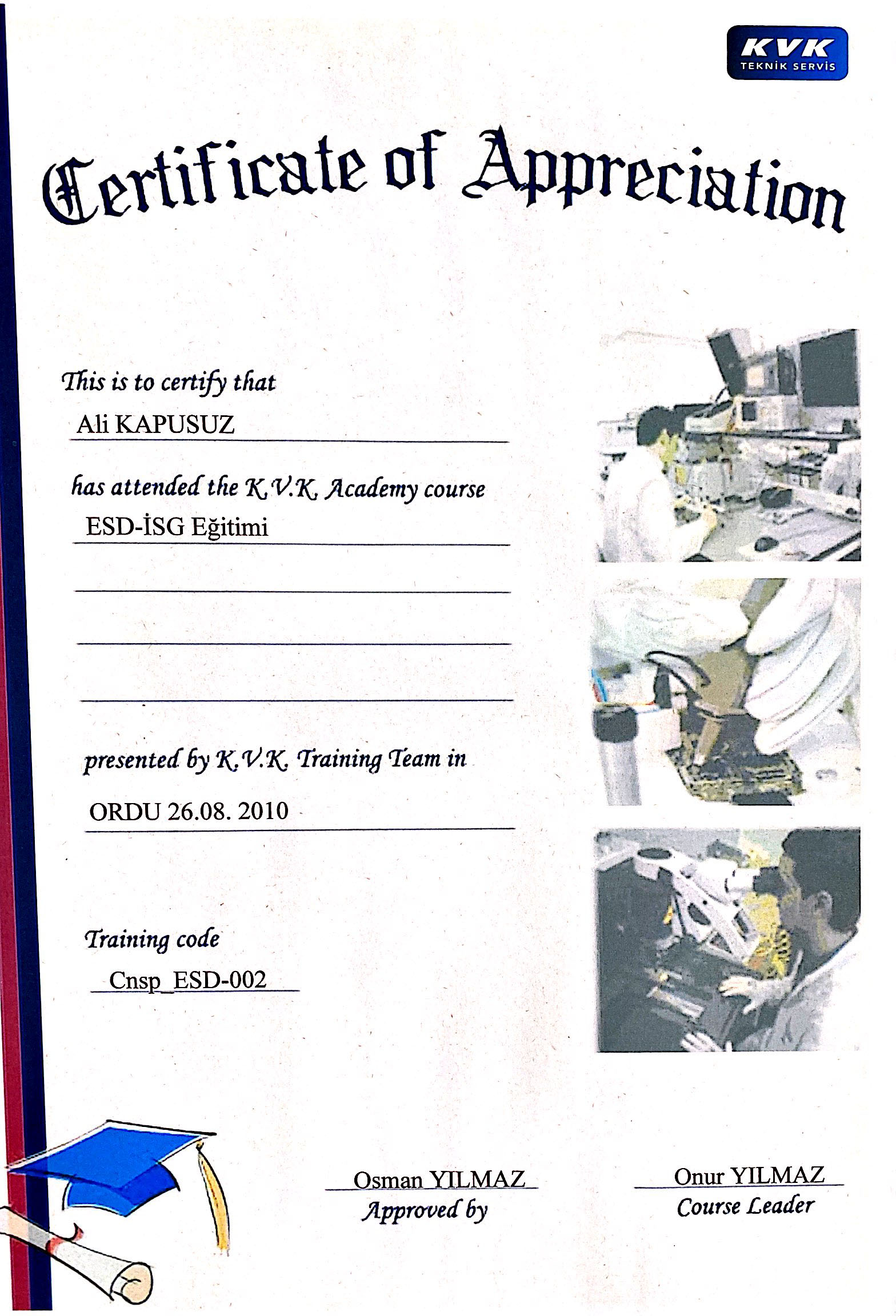 2010 Yılında KVK Teknik Servis laborant sertifikasını aldı.